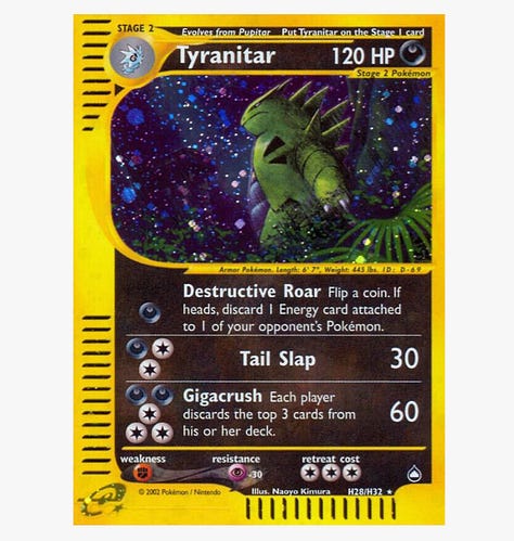 Things reach vintage status when they are between 20 and 25 years old. In Pokemon terms, we’ve generally seen the WOTC era for English, and Old Back era in Japanese as vintage. But now, I don’t think it would be controversial to consider the e-series eras from 2002-2006 as vintage.